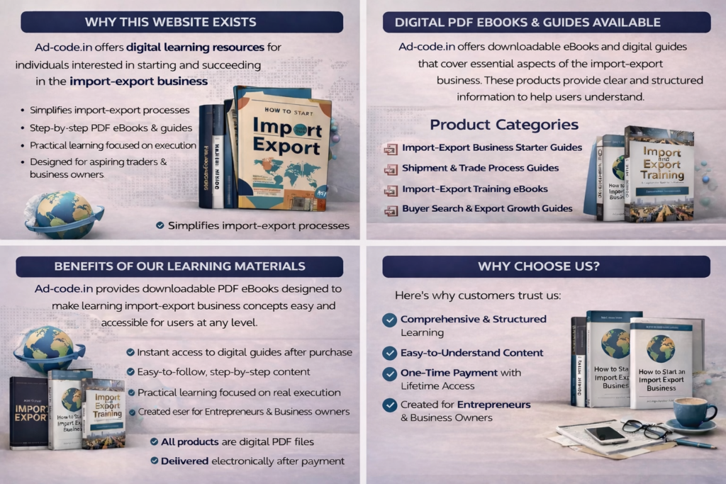 ad-code.in is created to simplify the import–export business for individuals and small businesses who want practical, step-by-step guidance in one place. Many aspiring traders struggle to understand how to start, manage shipments, find buyers, and execute international trade processes correctly. Our platform bridges this gap by offering structured digital learning resources that explain complex topics in a simple and actionable manner.